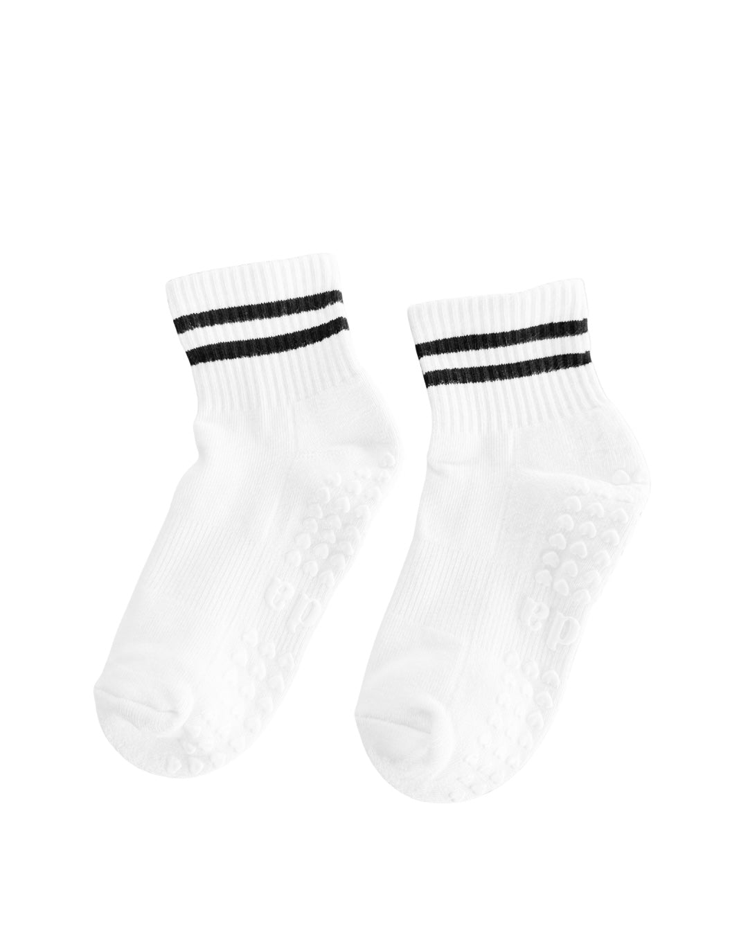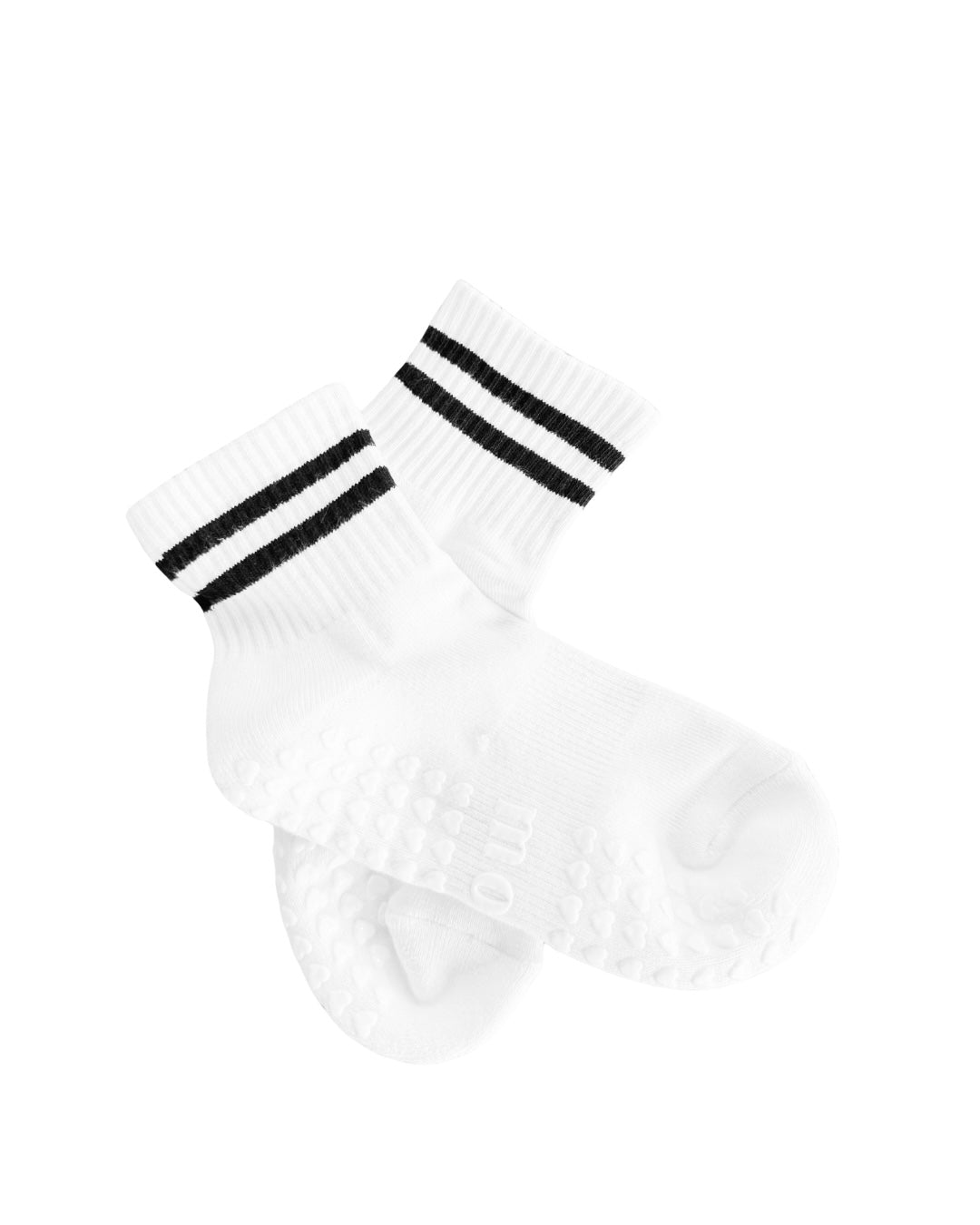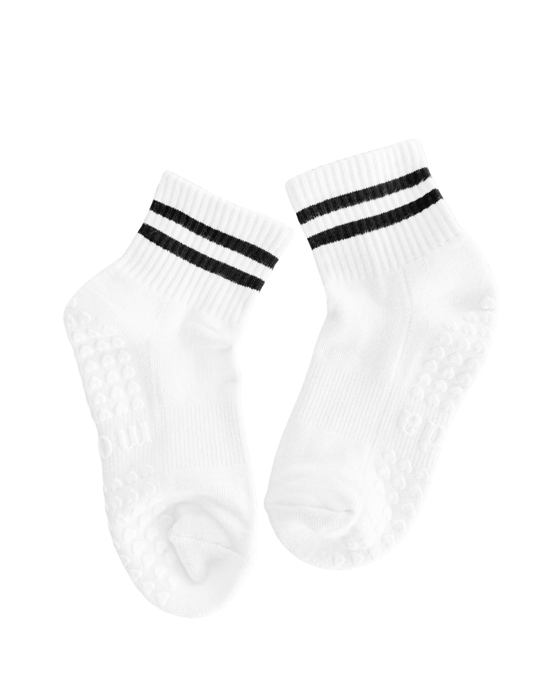 your favorite basic bae daily grip sock, now in white. white cotton base with white grips and black stripes, to match every fit!